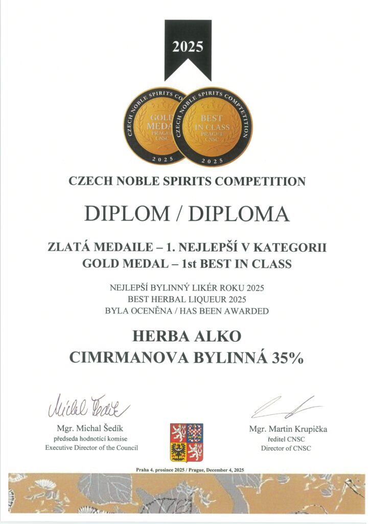 👉 Před pár měsíci získala Cimrmanova bylinná titul „Nejlepší bylinný likér roku 2025“ v celostátní soutěži CNSC a pevně věříme, že se v naší zemičce stane veřejně známým a oblíbeným sladce-hořkým bylinným likérem. 😉